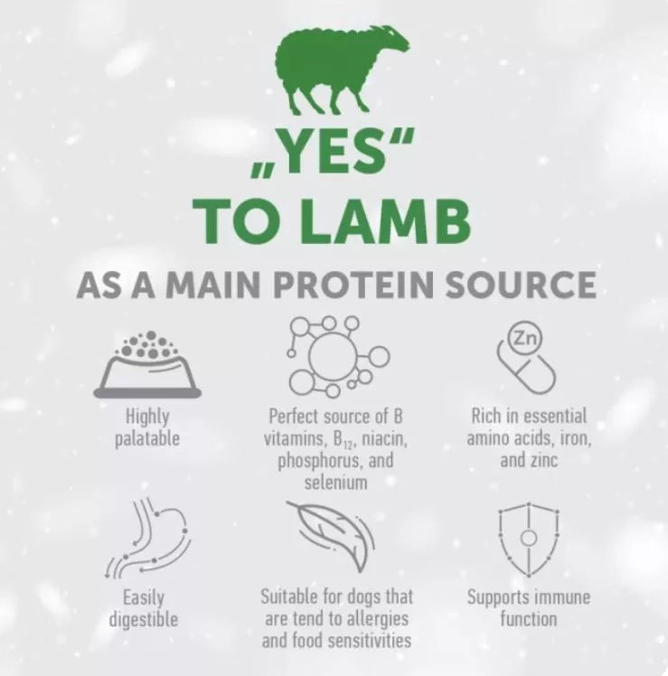 Samenstelling: lamsvlees 40% (gedroogd en fijngemalen), gedroogde aardappelpulp, zoete aardappel, erwten, vet van gevogelte, krillmeel (4%), suikerbietenpulp, zalmolie, dynamisch gemicroniseerd clinoptiloliet (1%), lijnzaad, fructooligosacchariden (FOS), yucca-extract, groene thee-extract, goudsbloem gedroogd (bron van luteïne).